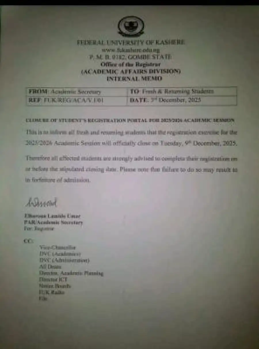 The Federal University of Kashere (FUK), Gombe State, has issued an internal memo announcing the official closure of the student registration portal for the 2025/2026 academic session.