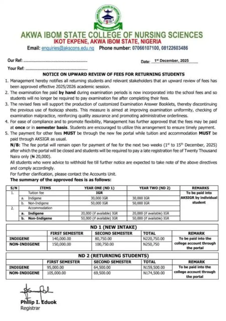 The management of the Akwa Ibom State College of Nursing Sciences has announced an upward review of fees for all returning students, effective from the 2025/2026 academic session. This update was contained in an official notice signed by the Registrar, Philip I. Eduok.
