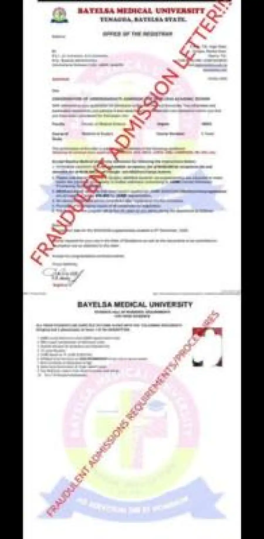 The management of Bayelsa Medical University (BMU) has issued an alert to the public regarding the circulation of a fake admission letter and a fraudulent “requirements/procedures” document currently being shared online.