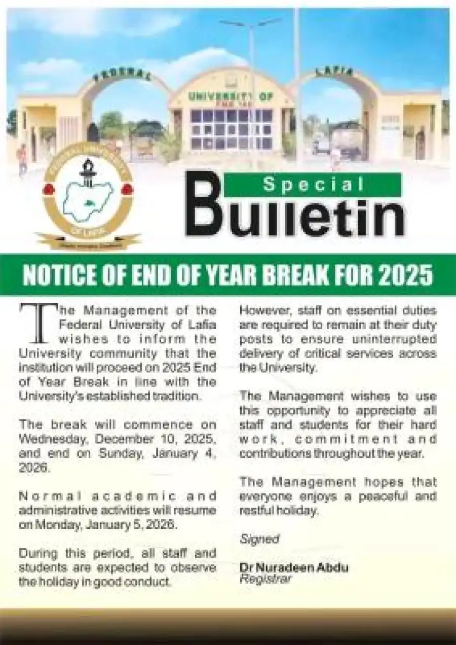 The Management of the Federal University of Lafia (FULafia) has officially announced the dates for the 2025 End of Year Break, adhering to the University's established tradition.
