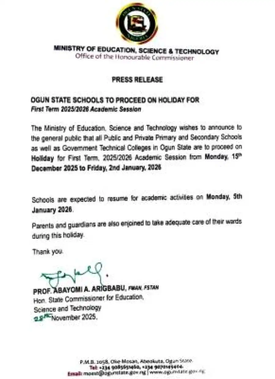 In a press release signed by the Honourable Commissioner for Education, Prof. Abayomi A. Arigbabu, the Ministry directed all public and private primary and secondary schools, as well as Government Technical Colleges across the state, to proceed on holiday from Monday, 15th December 2025, to Friday, 2nd January 2026.