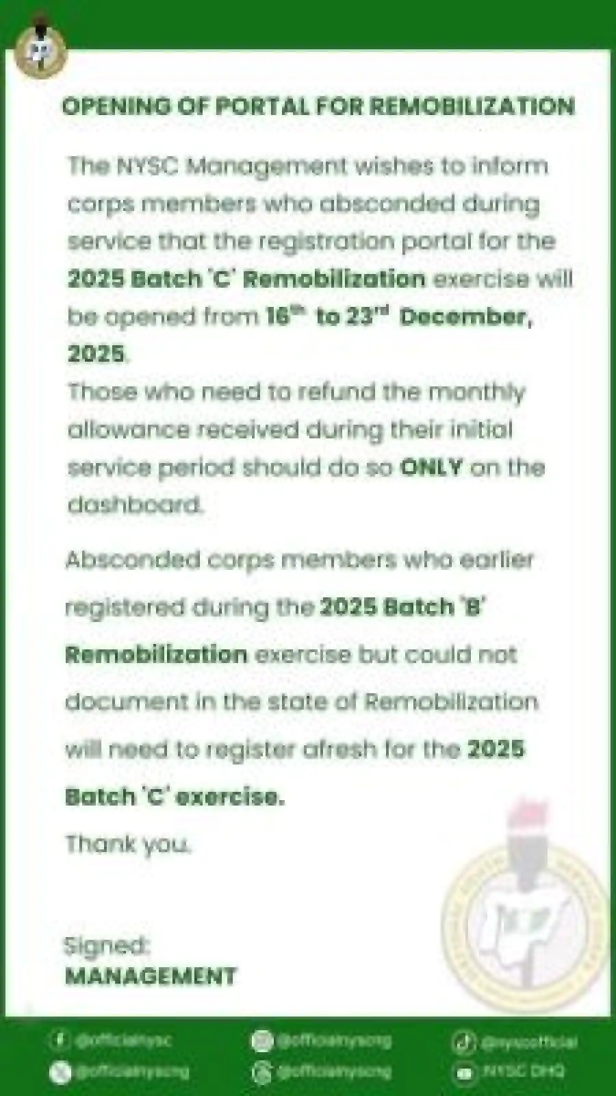 According to the announcement, the registration portal will be open from 16th to 23rd December, 2025. The exercise is specifically for corps members who absconded during their service year and are seeking to complete the National Service programme.