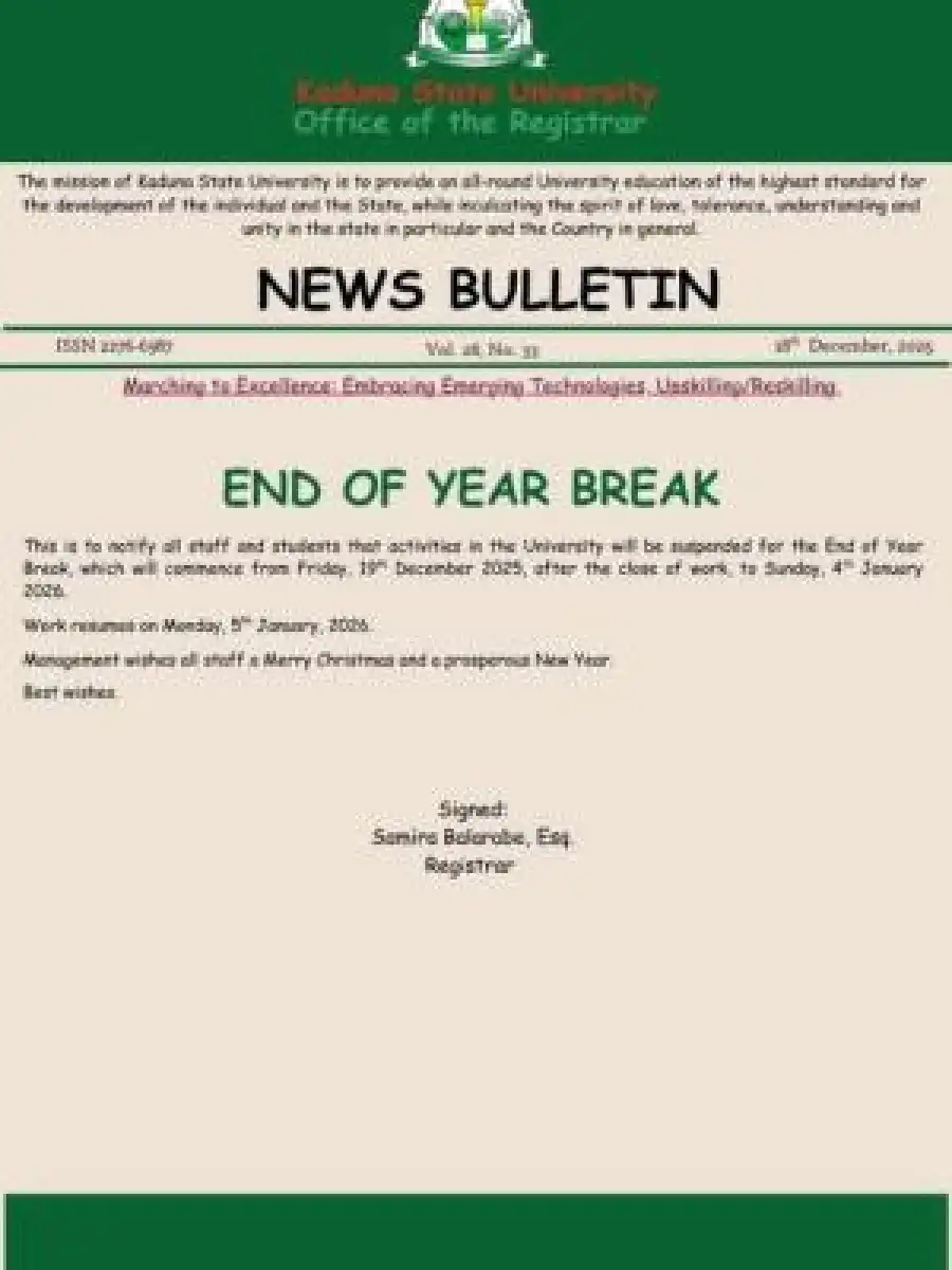 The Management of Kaduna State University (KASU), through the Office of the Registrar, has announced the suspension of all academic and administrative activities in the University for the End of Year Break.