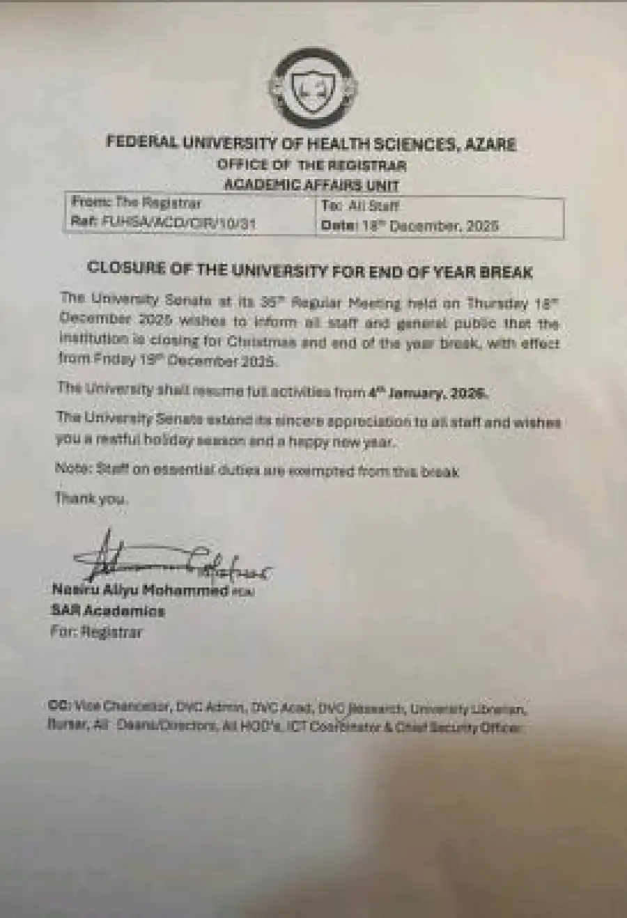 The University Senate of the Federal University of Health Sciences, Azare, at its 35th Regular Meeting held on Thursday, 18 December 2025, has approved the closure of the University for the Christmas and End-of-Year break.