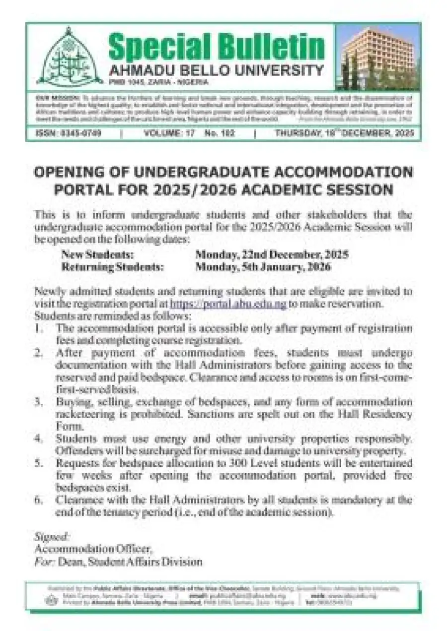 The Management of Ahmadu Bello University (ABU), Zaria, has officially announced the schedule for opening its undergraduate accommodation reservation portal for the 2025/2026 Academic Session.