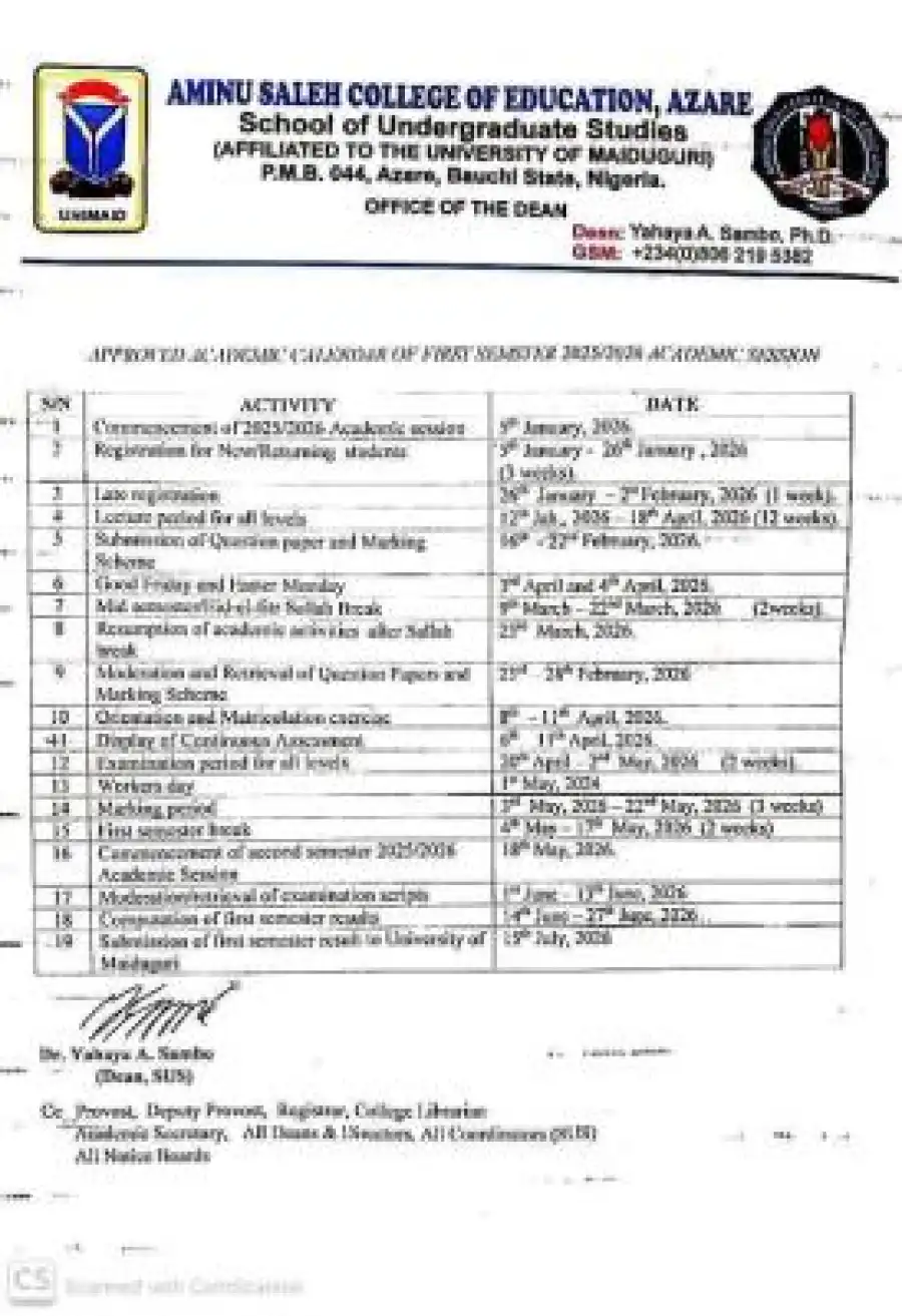 The management of Aminu Saleh College of Education, Azare (ASCOEA) has released the approved academic calendar for the first semester of the 2025/2026 academic session.