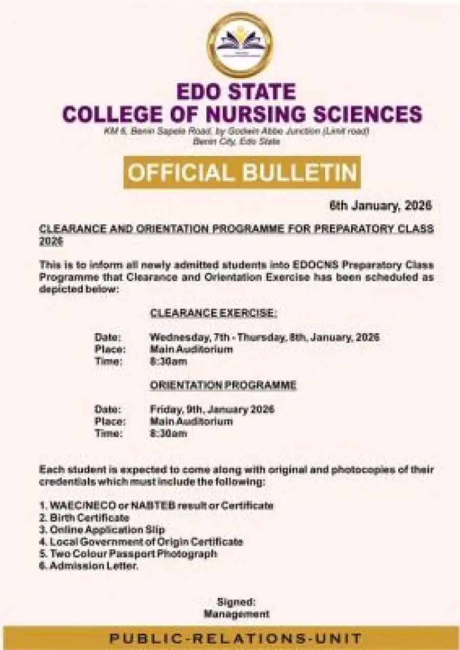 The Edo State College of Nursing Sciences (EDOCNS), located at KM 6, Benin–Sapele Road, by Godwin Abbe Junction (Limit Road), Benin City, Edo State, has announced the schedule for the clearance and orientation programme for newly admitted students into its Preparatory Class Programme for the 2026 academic session.