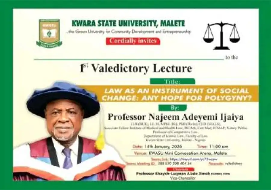 The lecture, titled “Law as an Instrument of Social Change: Any Hope for Polygyny?”, will be delivered by Professor Najeem Adeyemi Ijaiya, a renowned scholar of Comparative and Islamic Law in the Faculty of Law, Kwara State University.