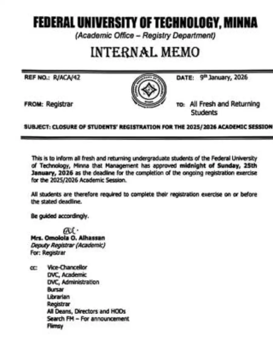 The memo, signed on behalf of the Registrar by Mrs. Omolola O. Alhassan, Deputy Registrar (Academic), stated that the registration exercise will officially close at midnight on Sunday, January 25, 2026.