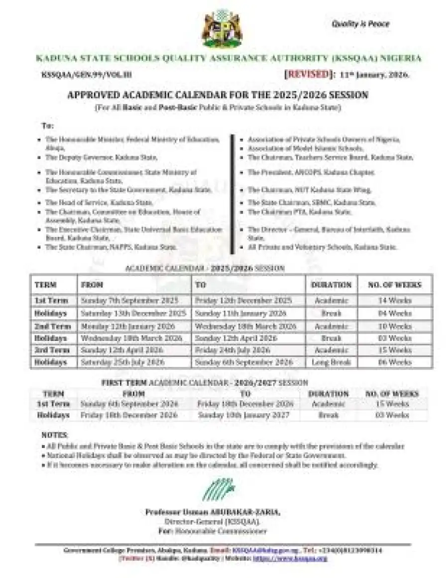 The Kaduna State Schools Quality Assurance Authority (KSSQAA) has officially released the revised and approved academic calendar for the 2025/2026 session, applicable to all basic and post-basic public and private schools across the state.