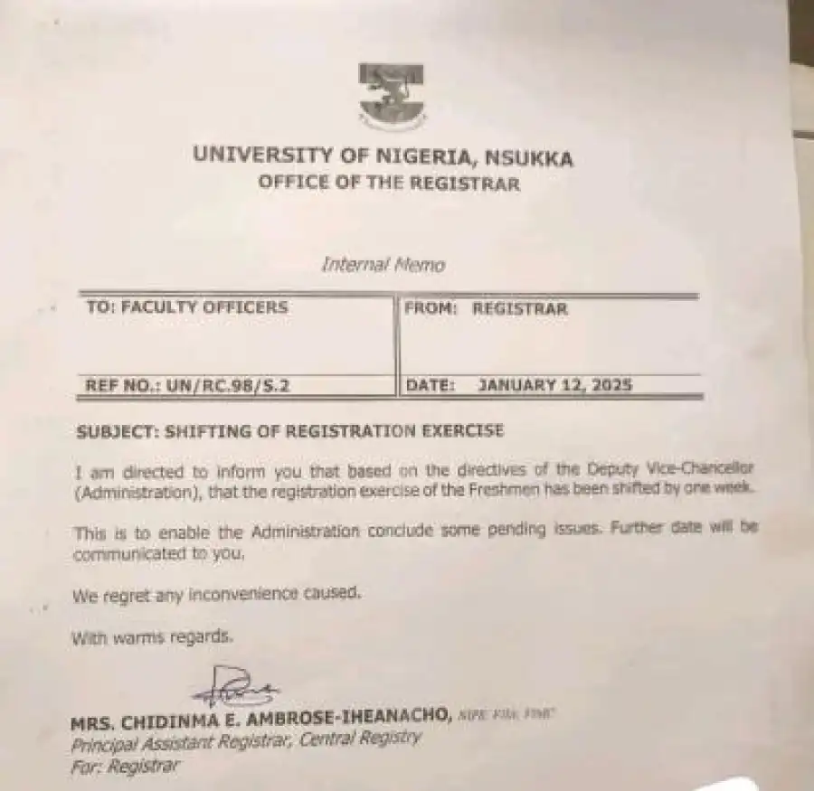 The memo, addressed to all Faculty Officers, stated: "I am directed to inform you that based on the directives of the Deputy Vice-Chancellor (Administration), the registration exercise of the Freshmen has been shifted by one week."