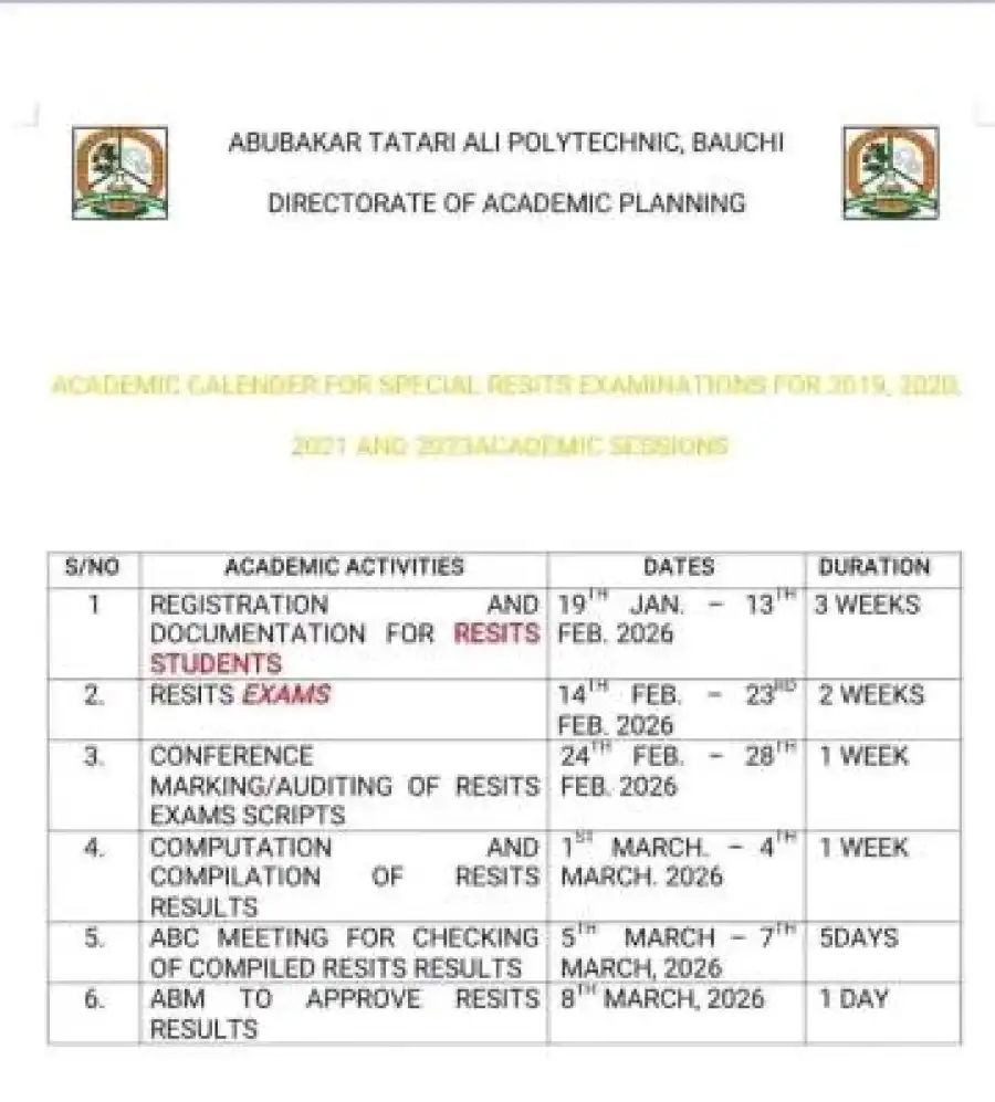 The Directorate of Academic Planning at Abubakar Tatari Ali Polytechnic, Bauchi, has released the academic calendar for special resit examinations covering the 2019, 2020, 2021, and 2023 academic sessions.