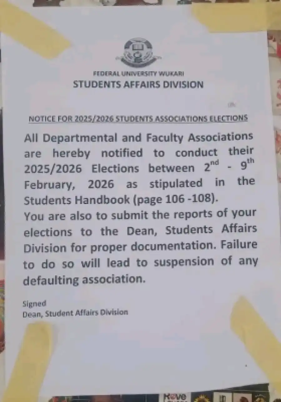 The Federal University Wukari’s Students Affairs Division has issued a formal notice to all departmental and faculty associations, scheduling their 2025/2026 Students Association Elections to be held from 2nd to 9th February, 2026.