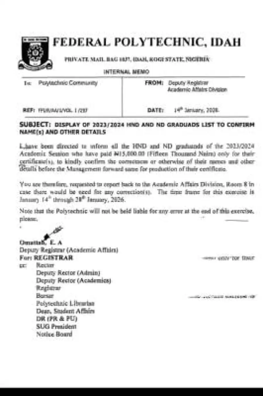According to an internal memo dated 14th January, 2026, and signed by the Deputy Registrar (Academic Affairs), E. A. Omattah, all ND and HND graduates of the 2023/2024 academic session who have paid the prescribed ₦15,000 certificate fee are required to carefully confirm the correctness of their names and other details.