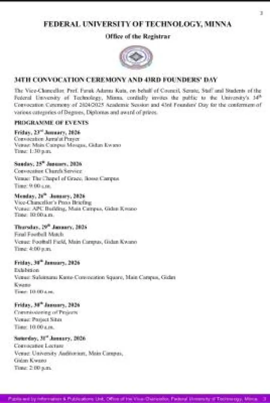 The Vice-Chancellor, Prof. Faruk Adamu Kuta, on behalf of Council, Senate, Staff and Students of the Federal University of Technology, Minna, cordially invites the public to the University's 34th Convocation Ceremony of 2024/2025 Academic Session and 43rd Founders' Day for the conferment of various categories of Degrees, Diplomas and award of prizes.