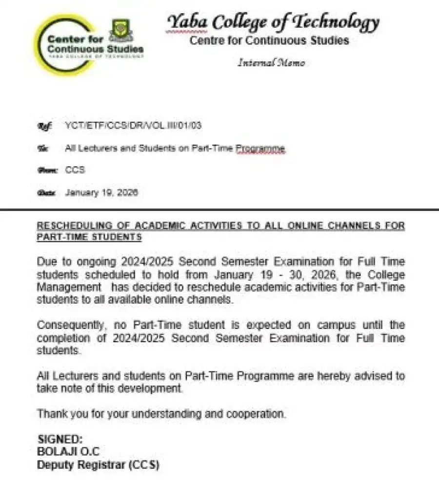 Due to ongoing 2024/2025 Second Semester Examination for Full Time students scheduled to hold from January 19th - 30th, 2026, the College management has decided to reschedule academic activities for Part-Time students to all available online channels.