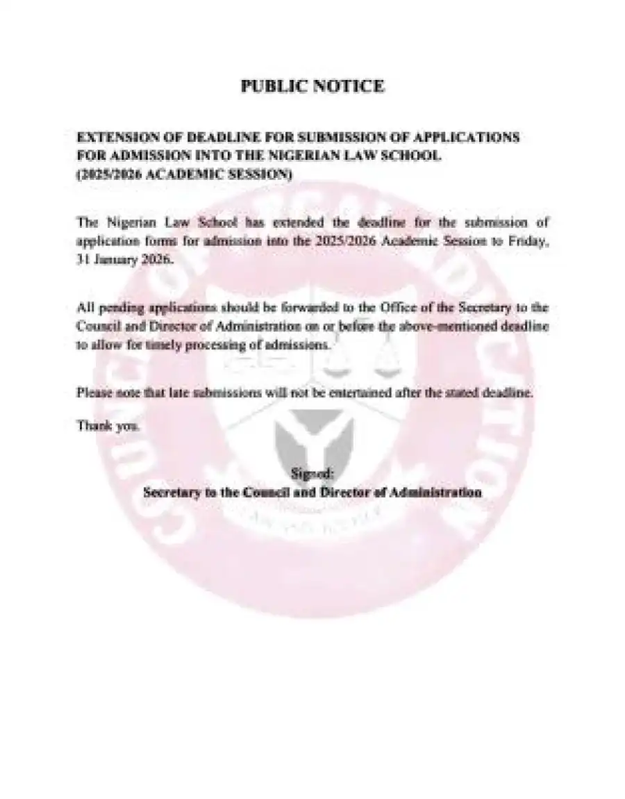 The Council of Legal Education, Nigerian Law School, has announced an extension of the application deadline for admission into the 2025/2026 Academic Session.