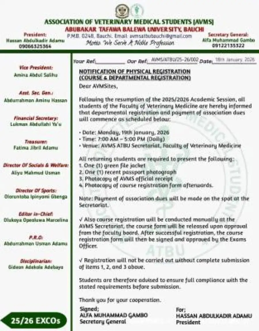 The Association of Veterinary Medical Students (AVMS), Abubakar Tafawa Balewa University (ATBU), has released the schedule for mandatory physical registration for the 2025/2026 Academic Session.