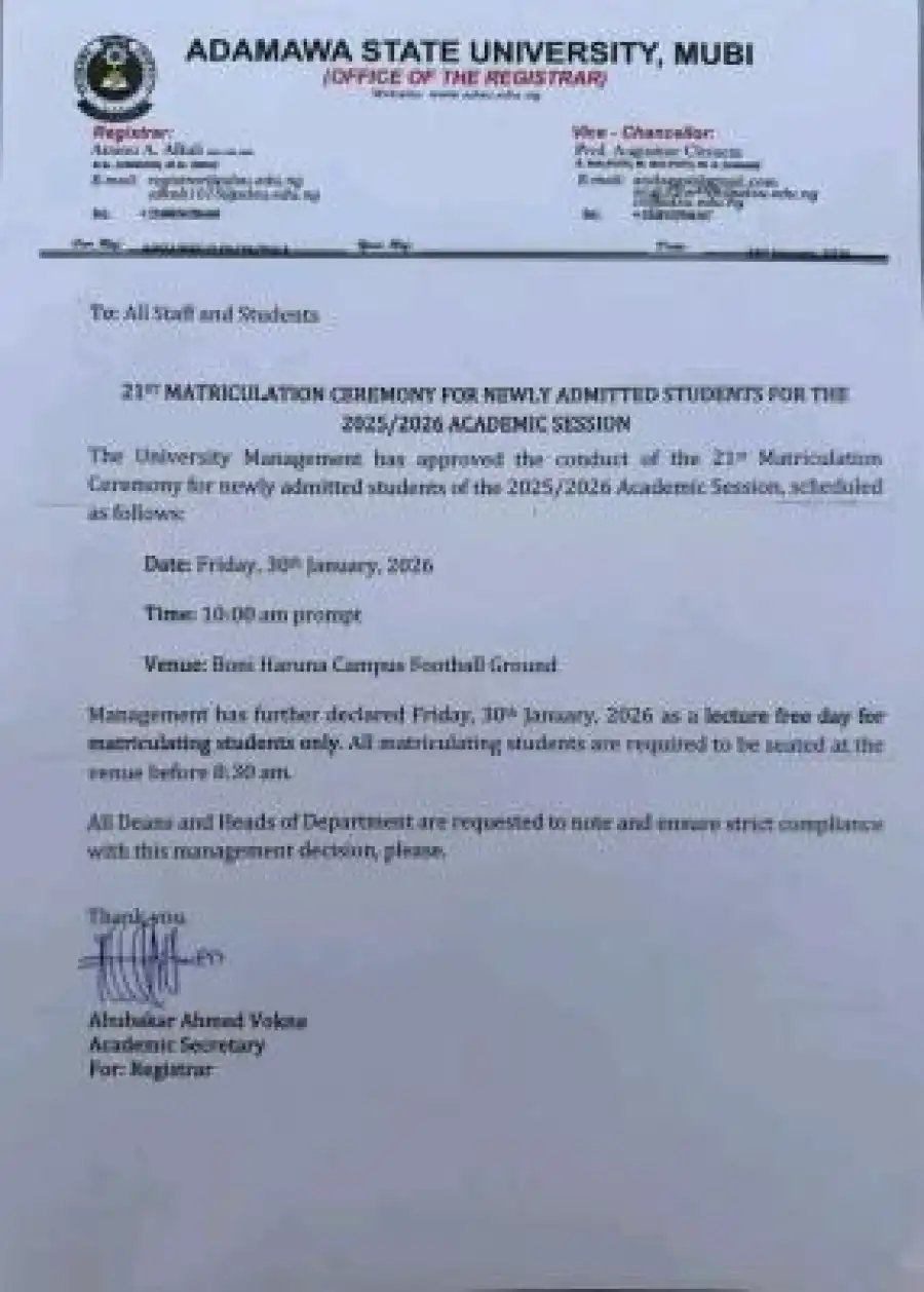The management of Adamawa State University, Mubi, has officially announced the schedule for its 21st Matriculation Ceremony for newly admitted students for the 2025/2026 Academic Session.