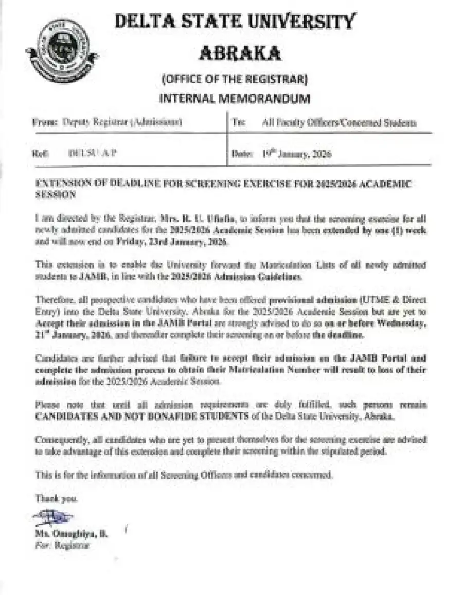 Therefore, all prospective candidates who have been offered provisional admission (UTME & Direct Entry) into the Delta State University, Abraka for the 2025/2026 Academic Session but are yet to Accept their admission in the JAMB Portal are strongly advised to do so on or before Wednesday, 21 January, 2026, and thereafter complete their screening on or before the deadline.