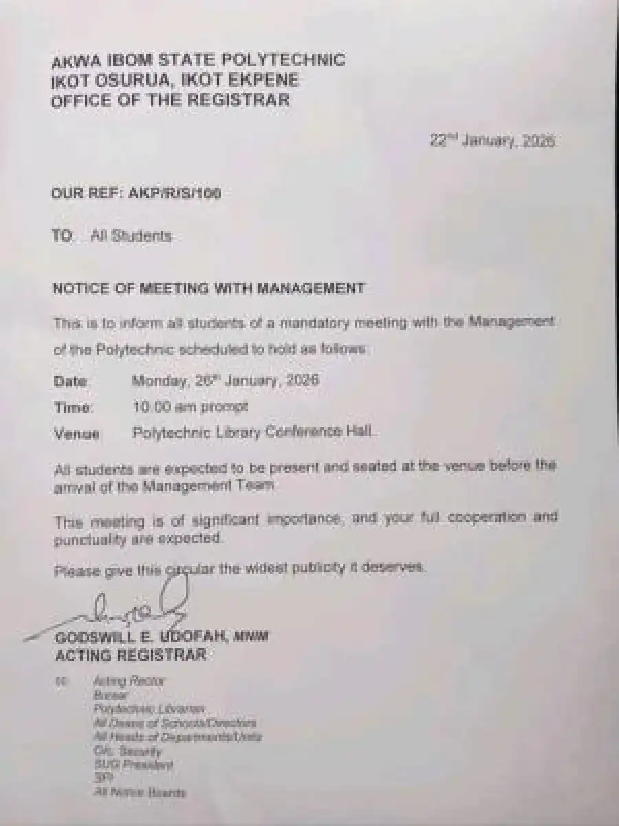 The Management of Akwa Ibom State Polytechnic, Ikot Osurua, Ikot Ekpene, has announced a mandatory meeting with all students of the institution.
