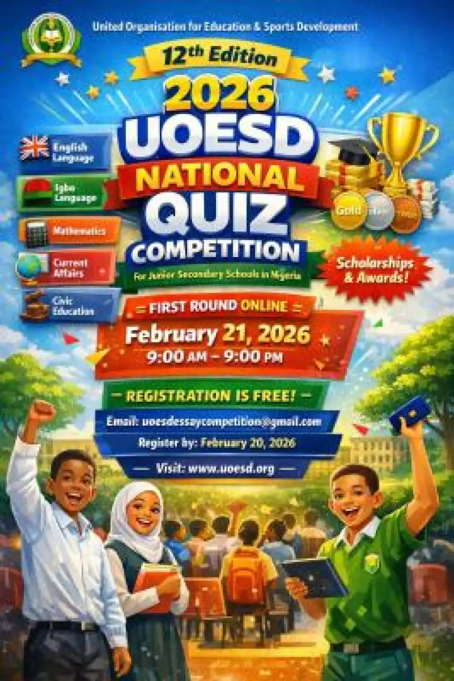 The United Organisation for Education and Sports Development (UOESD) is pleased to announce that registration is now open for the 12th Edition of the National Quiz Competition for Junior Secondary School (JSS 1–3) students across Nigeria.