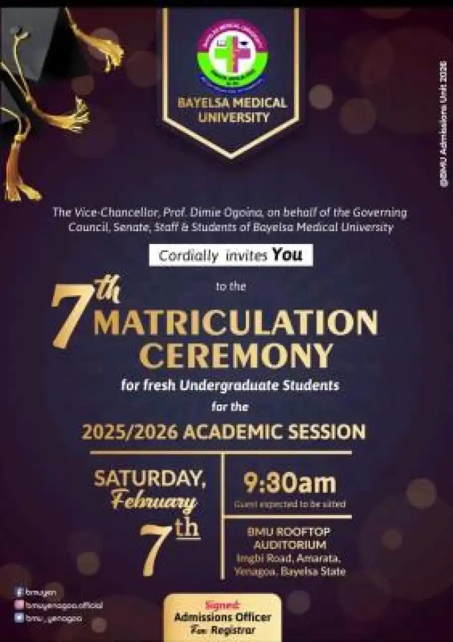 The management of Bayelsa Medical University (BMU) is pleased to announce its upcoming 7th Matriculation Ceremony, officially welcoming the newest cohort of undergraduate students into the university community for the 2025/2026 academic session.