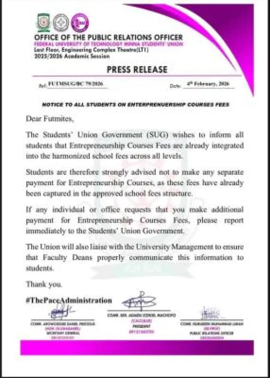The Students’ Union Government (SUG) of the Federal University of Technology, Minna, has issued an official clarification regarding the payment of Entrepreneurship Courses Fees for the 2025/2026 Academic Session.