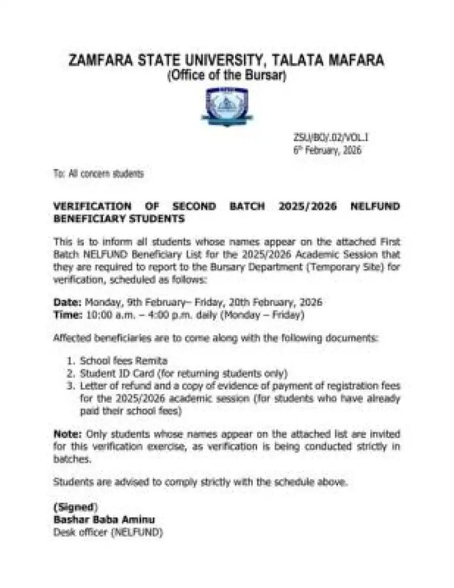 Management of Zamfara State University, Talata Mafara, through the Office of the Bursar, has announced the commencement of verification for students listed under the Second Batch of the 2025/2026 NELFUND Beneficiary Scheme.