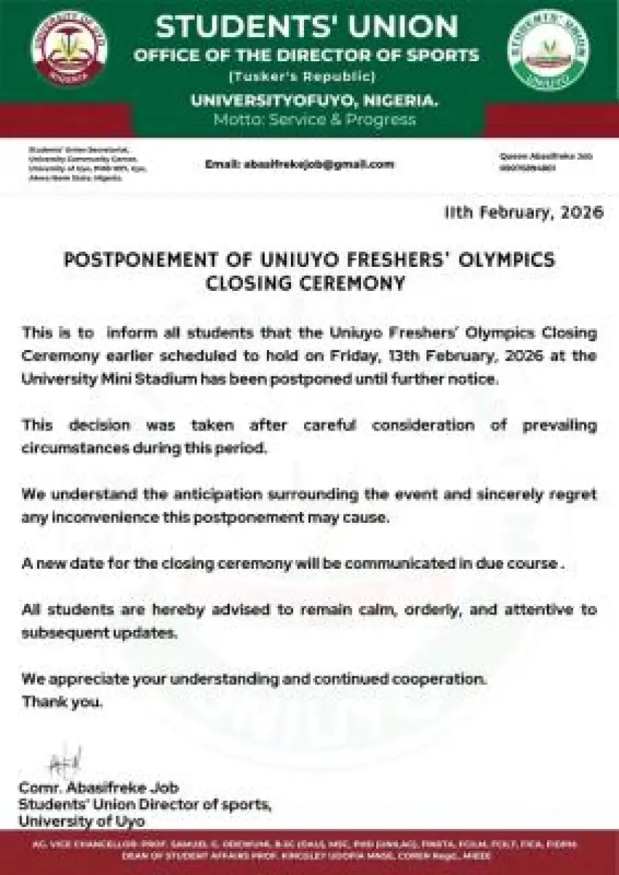 The University of Uyo Students’ Union has announced the postponement of the Uniuyo Freshers’ Olympics Closing Ceremony, originally scheduled to take place on Friday, 13th February, 2026, at the University Mini Stadium.