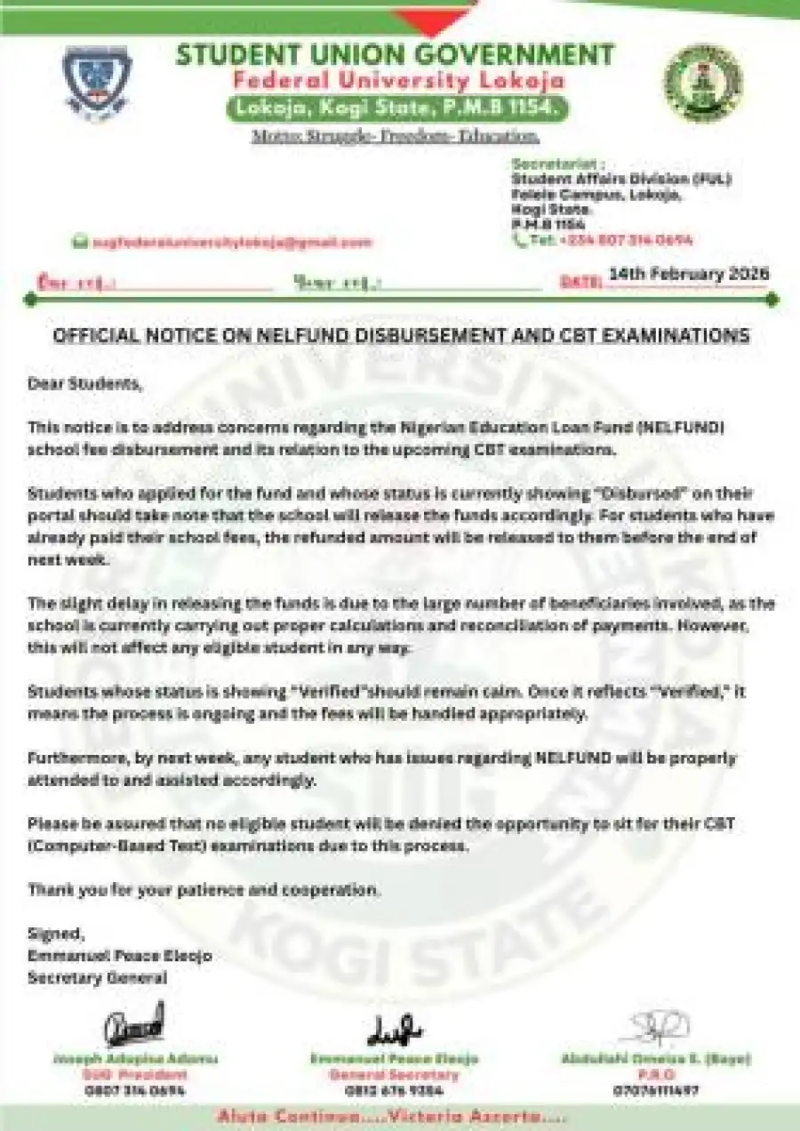 FULOKOJA SUG notice to students on loan disbursement, CBT examination