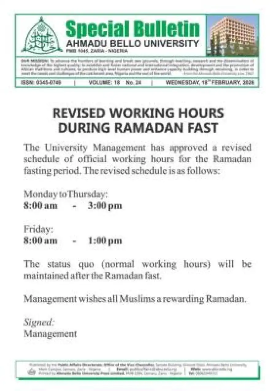 The Management of Ahmadu Bello University (ABU), Zaria, has approved a revised schedule of official working hours for the Ramadan fasting period.