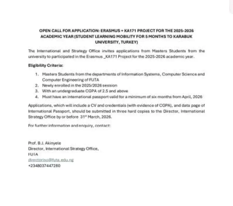 According to the notice, the call is open to newly enrolled Master’s students in the 2025/2026 session from the Departments of Information Systems, Computer Science, and Computer Engineering at FUTA. Applicants must possess a minimum undergraduate CGPA of 2.5 and hold an international passport valid for at least six months from April 2026.