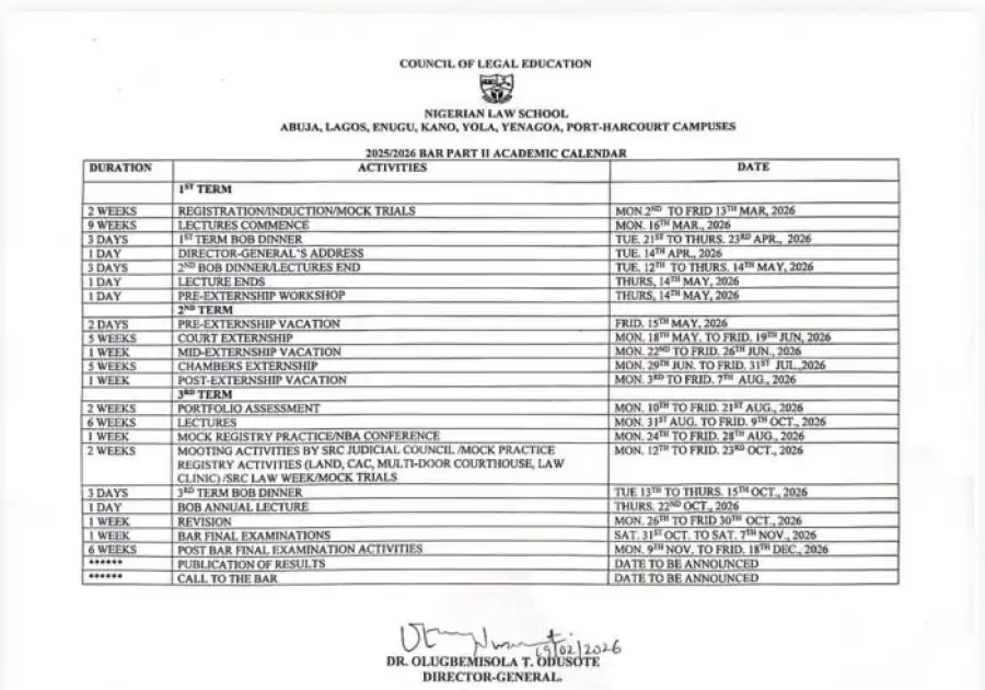 The Nigerian Law School, under the Council of Legal Education, has officially released the academic calendar for the 2025/2026 Bar Part II programme across its Abuja, Lagos, Enugu, Kano, Yola, Yenagoa and Port Harcourt campuses.