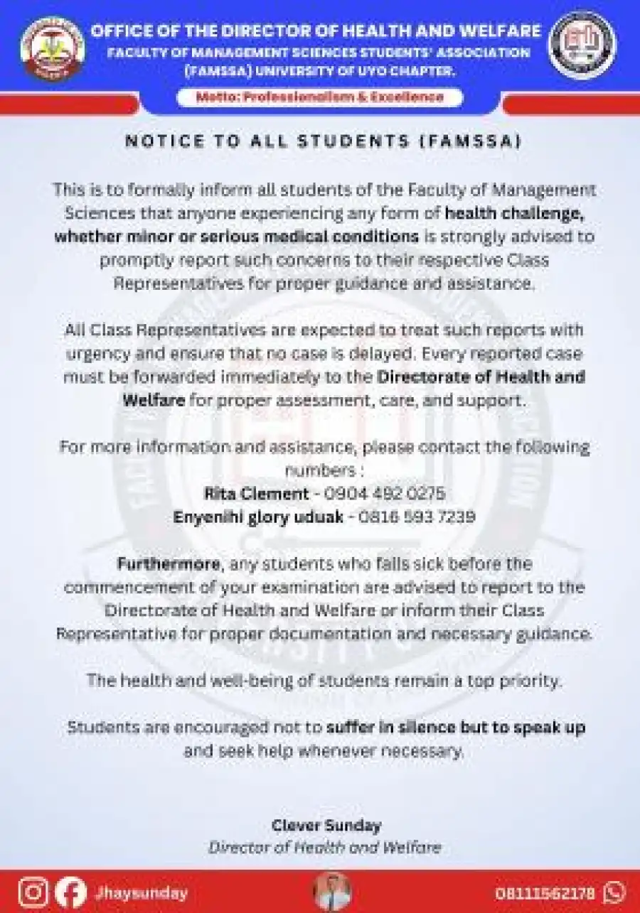 The Faculty of Management Sciences Students’ Association (FAMSSA), University of Uyo chapter, has issued an important notice encouraging students to promptly report any health-related challenges for proper support and intervention.