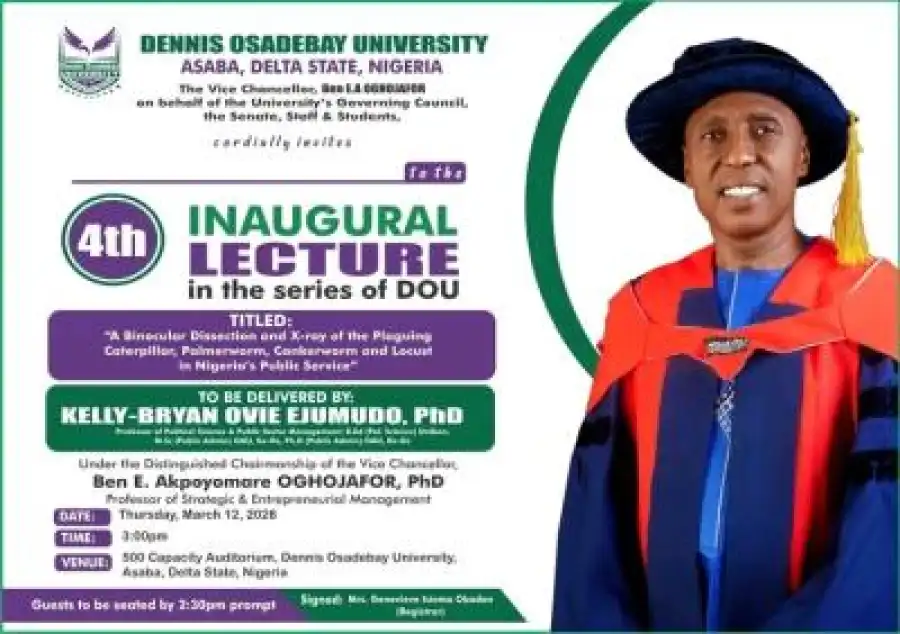 The lecture, titled “A Binocular Dissection and X-ray of the Plaguing Caterpillar, Palmeworm, Cankerworm and Locust in Nigeria’s Public Service,” will be delivered by Professor Kelly-Bryan Ovie Ejumudo, a Professor of Political Science and Public Sector Management.