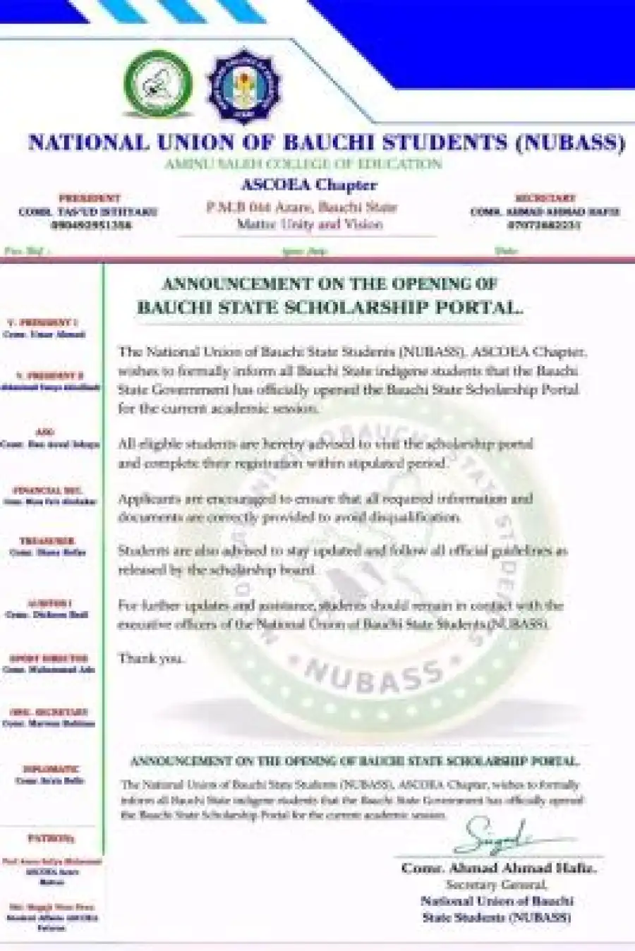 The Union further encourages students to adhere strictly to official guidelines released by the scholarship board and to stay in touch with NUBASS executive officers for updates and assistance.