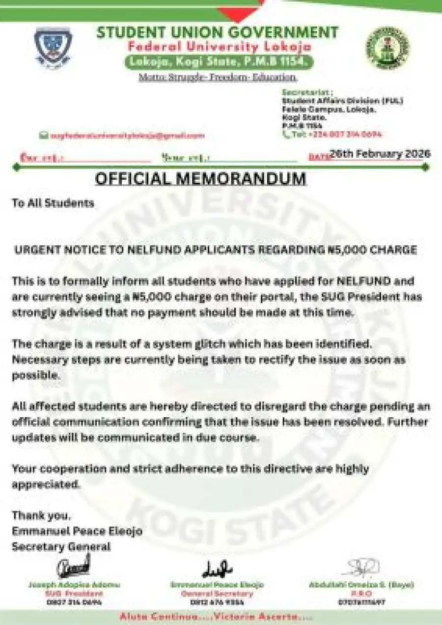 This is to formally inform all students who have applied for NELFUND and are currently seeing a #5,000 charge on their portal, the SUG President has strongly advised that no payment should be made at this time.