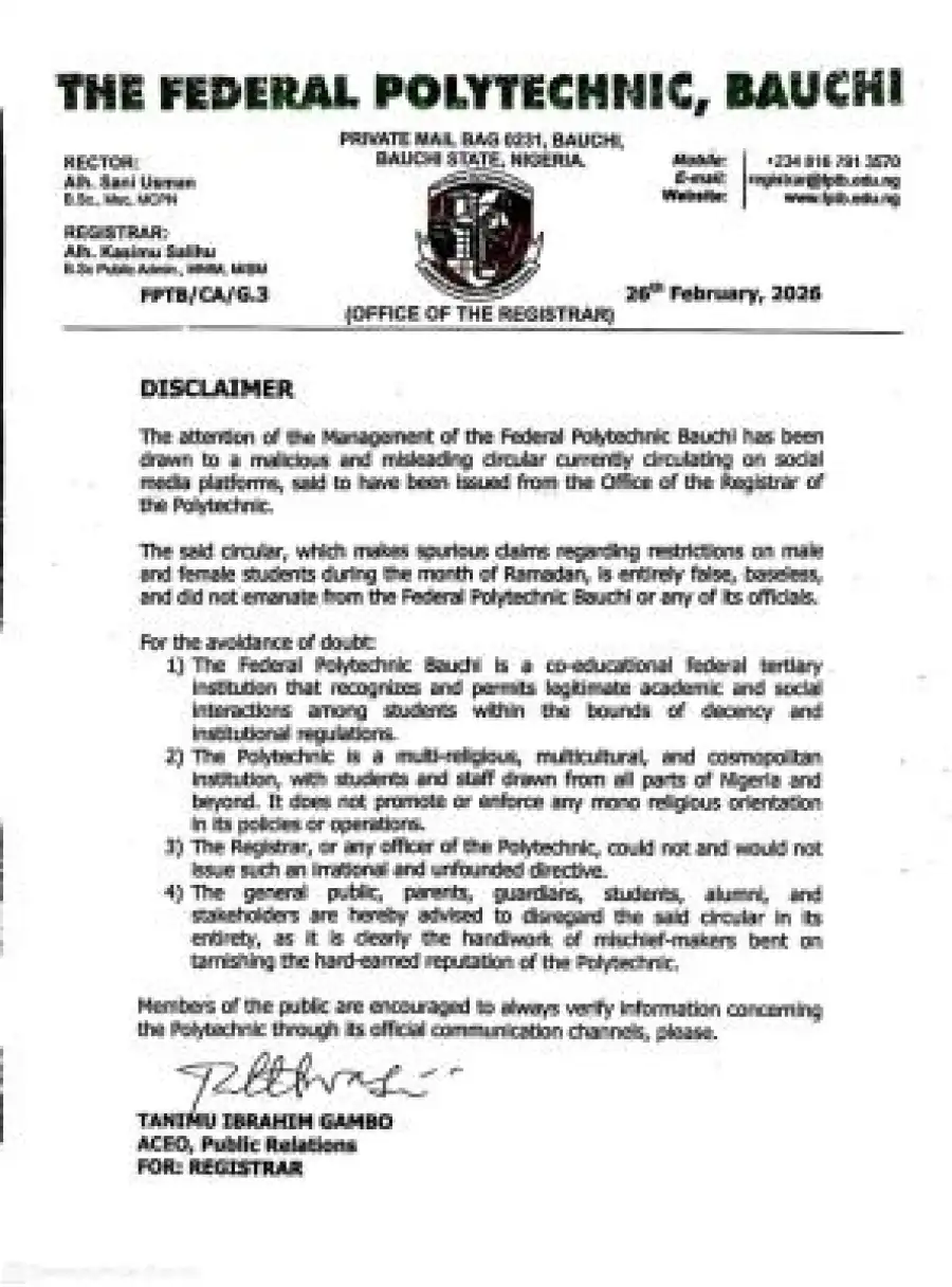 The management of The Federal Polytechnic, Bauchi, has dismissed as false a purported circular circulating on social media alleging restrictions on male and female students during the month of Ramadan.