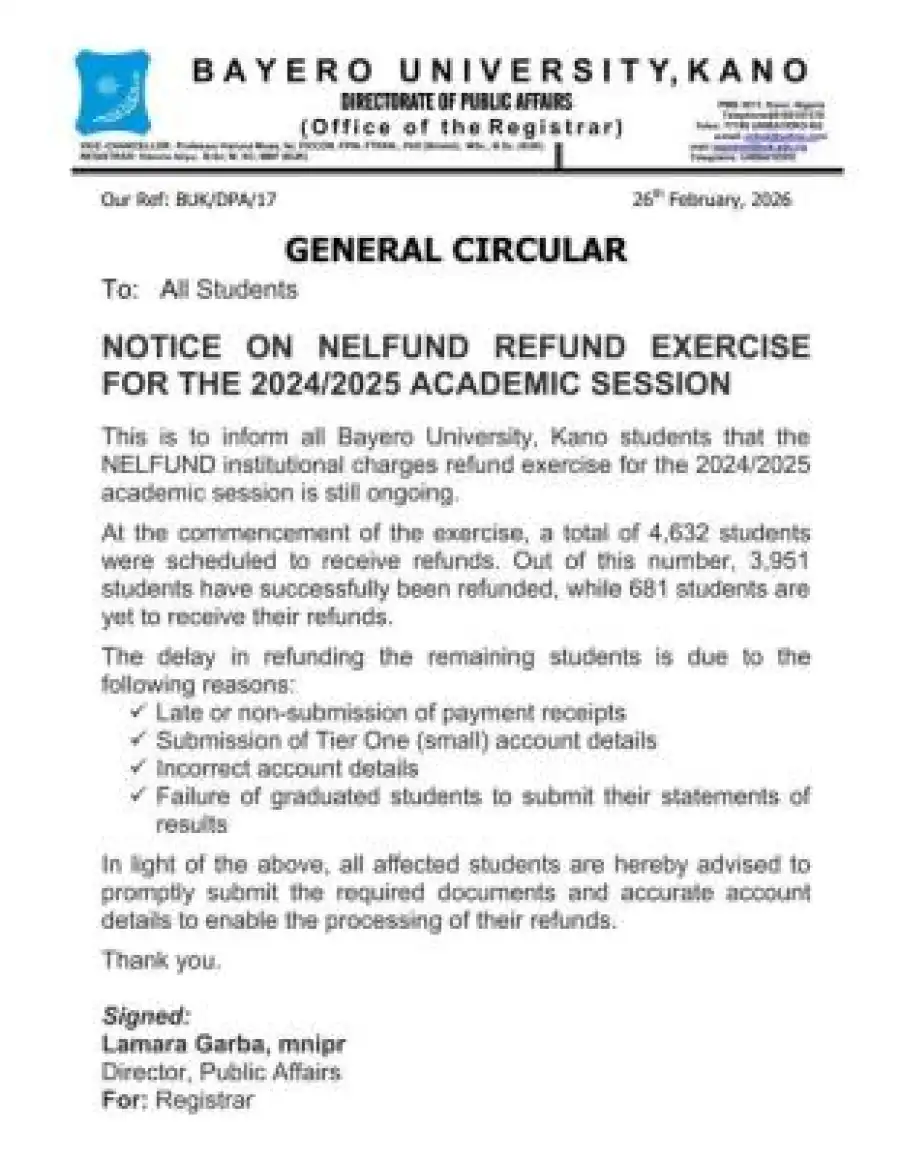 Bayero University, Kano (BUK) has issued an important notice to all students regarding the ongoing NELFUND institutional charges refund exercise for the 2024/2025 academic session.