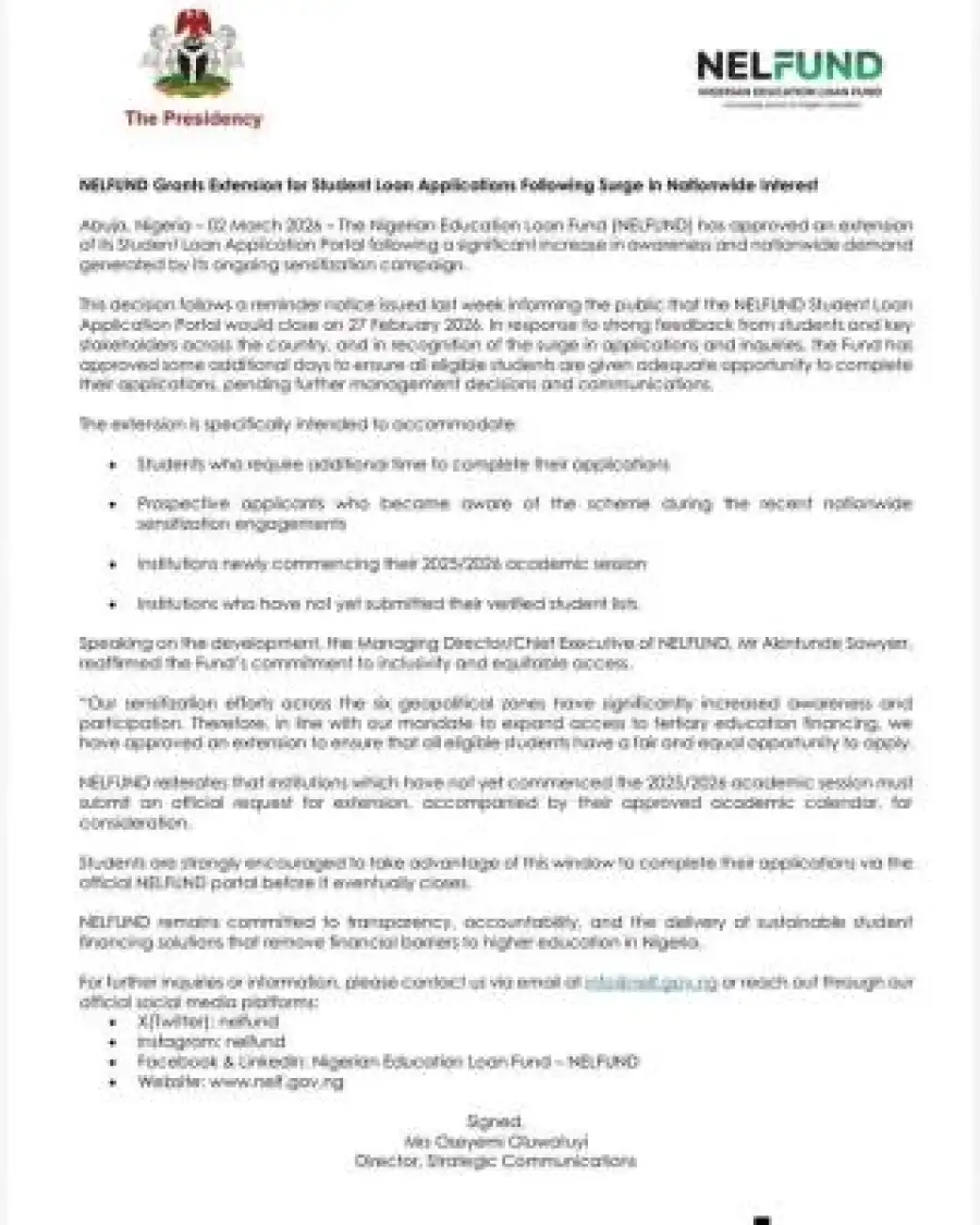 The Nigerian Education Loan Fund (NELFUND) has announced an extension of the application period for its student loan scheme, citing a massive increase in awareness and applications resulting from its ongoing nationwide sensitization campaign.