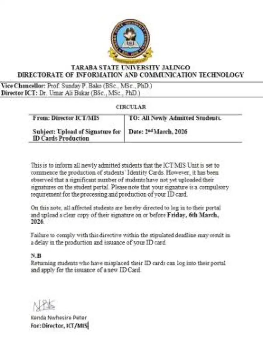 In a circular issued on Monday, the Director of ICT, Dr. Umar Ali Bukar, disclosed that a significant number of students are yet to upload their signatures on the student portal—a compulsory requirement for the processing of the ID cards.