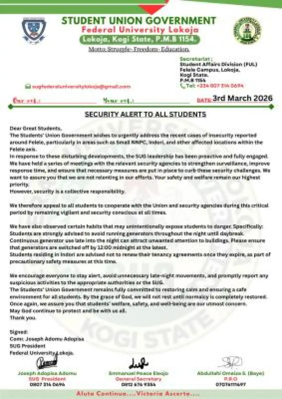 The Students' Union Government wishes to urgently address the recent cases of insecurity reported around Felele, particularly in areas such as Small NNPC, Indori, and other affected locations within the Felele axis.