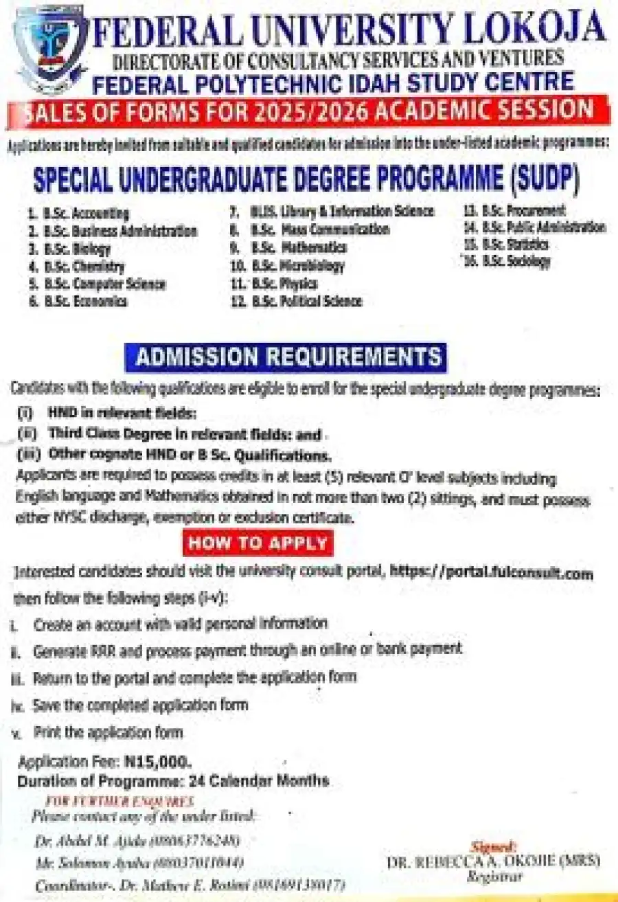 Idah Poly in affiliation with FULOKOJA admission into Special Undergraduate Degree programmes, 2025/2026