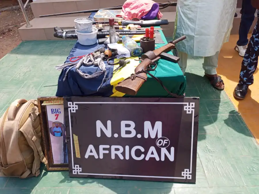 Items recovered from them included one locally made silver pistol with two live rounds of ammunition, one locally made shotgun, one locally crafted pump action single barrel firearm, two large portrait images bearing NBM secret cult insignia, two battle axes and assorted charms suspected to be used for criminal fortification.