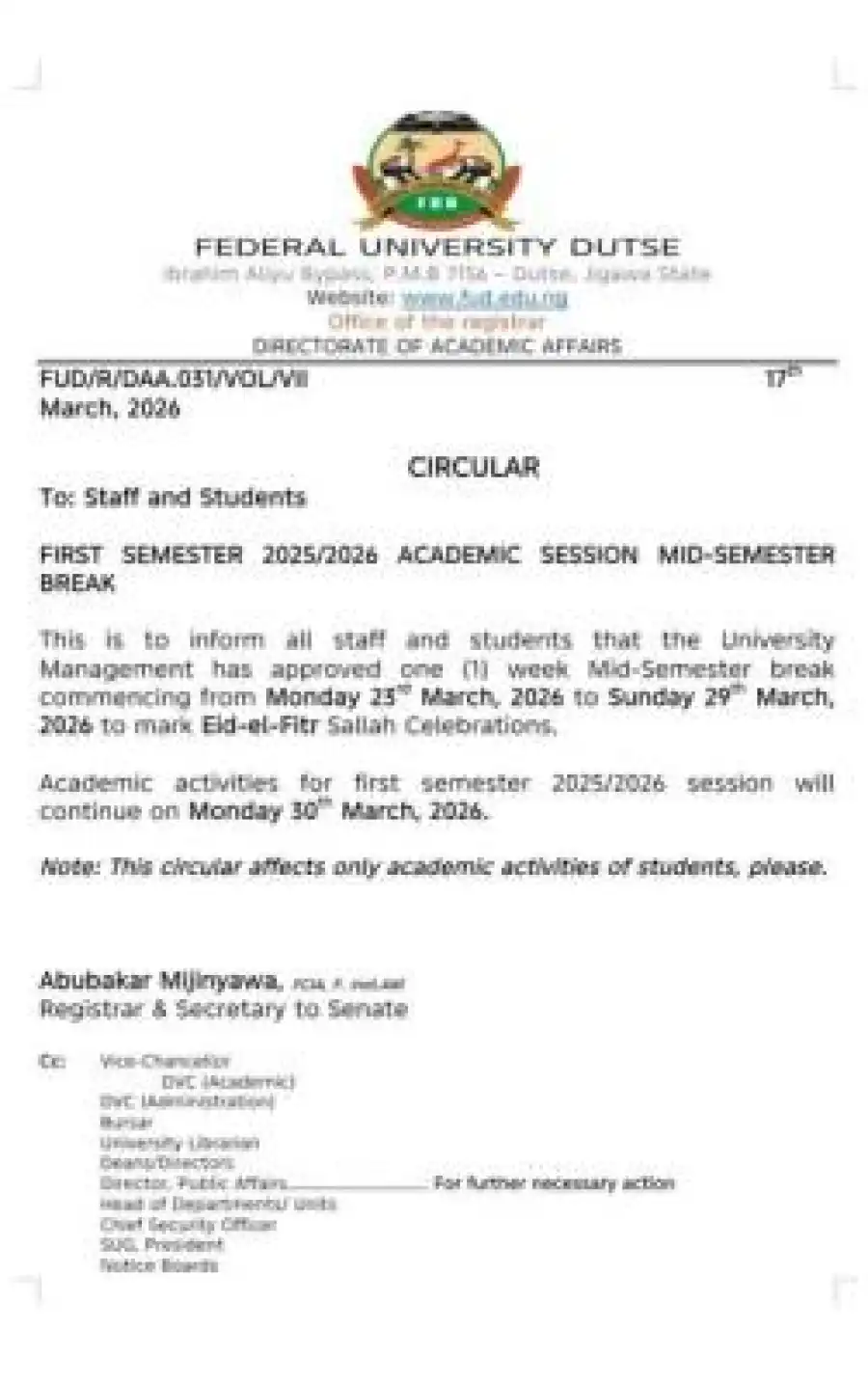 The management of the Federal University Dutse (FUD), Jigawa State, has officially announced a one-week mid-semester break for staff and students of the institution in celebration of the forthcoming Eid-el-Fitr (Sallah) festivities.