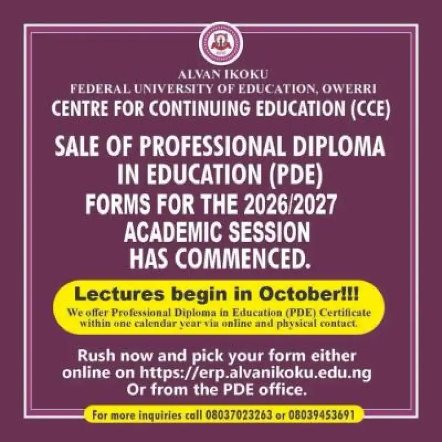 The Centre for Continuing Education (CCE) at Alvan Ikoku Federal University of Education, Owerri, has officially announced the commencement of the sale of application forms for the Professional Diploma in Education (PDE) for the 2026/2027 academic session.