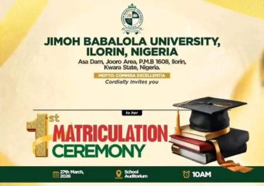 Jimoh Babalola University, Ilorin, cordially invites the public to its 1st Matriculation Ceremony — a historic moment marking the official induction of our pioneer students into the academic community.