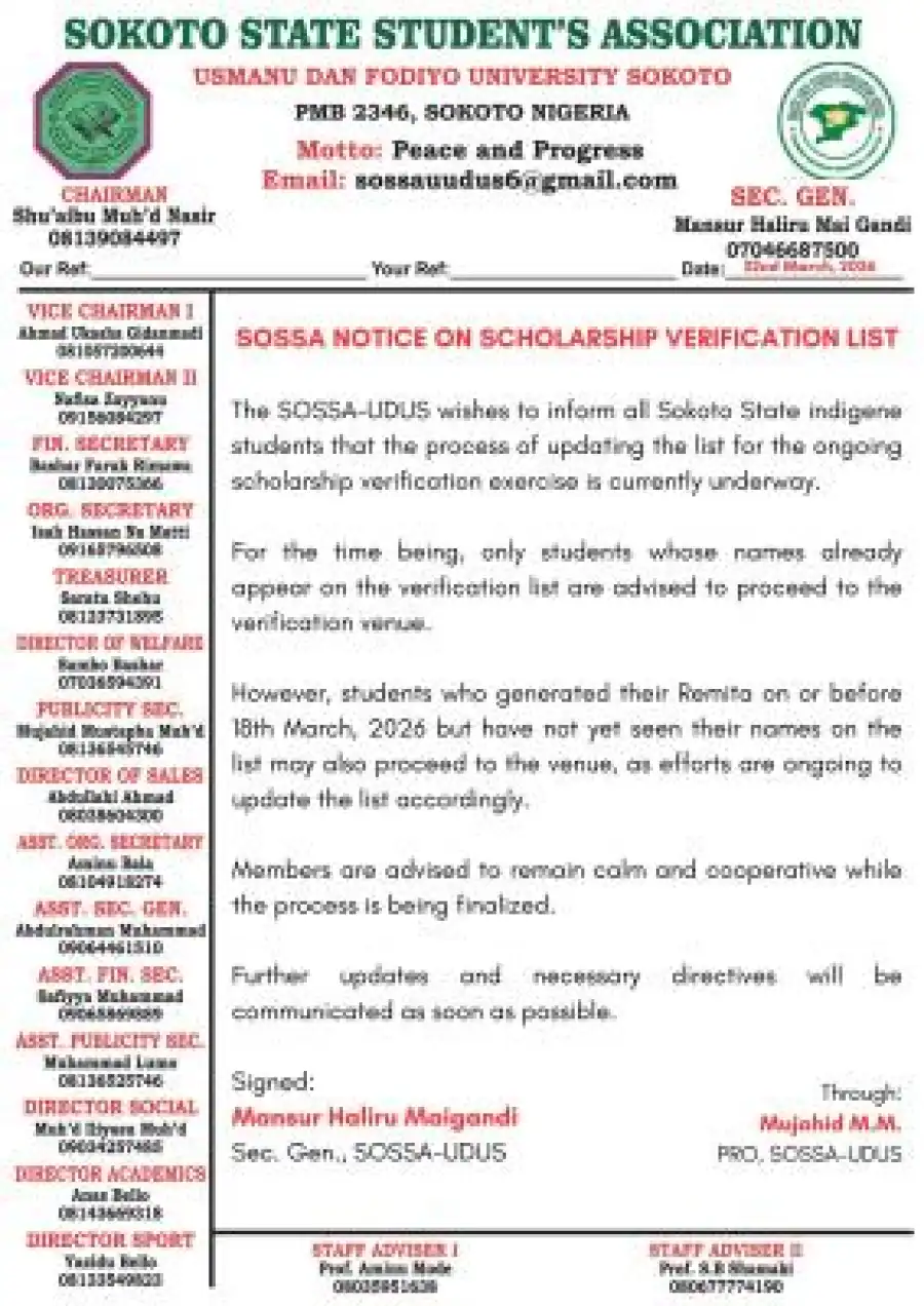 The SOSSA–UDUS wishes to inform all Sokoto State indigene students that the process of updating the list for the ongoing scholarship verification exercise is currently underway.
