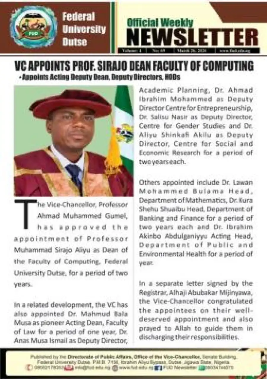 The Vice-Chancellor of Federal University Dutse, Professor Ahmad Muhammed Gumel, has approved the appointment of Professor Muhammad Sirajo Aliyu as the Dean of the Faculty of Computing for a period of two years.